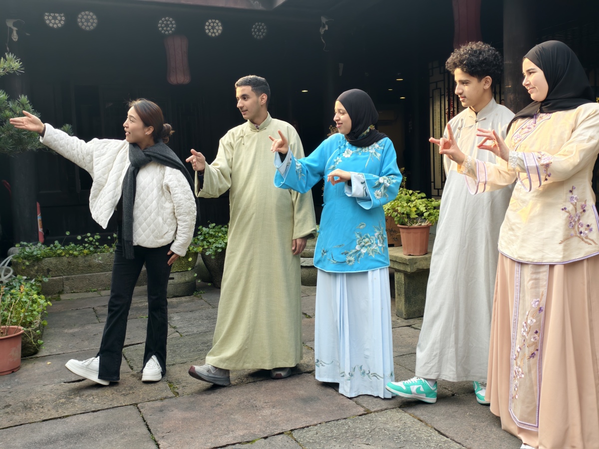 “推呀拉呀转,磨儿转得圆,一人推磨像车水,我们推磨像扯蓬船……”现场,留学生们还和甬剧演员张瑜老师学起了甬剧《双推磨》,张瑜老师一边唱一边向同学们教授动作。一句一唱,一指一点,一抬眼一蹙眉,大家都学得像模像样,细微之处更是传神。“我们穿上了戏服,很特别。我们还和老师一起学了歌词,学了动作,非常独特,这是一个很神奇的体验。”来自摩洛哥的Samira El Attar同学说。